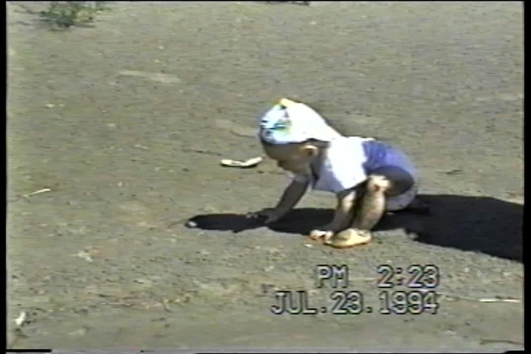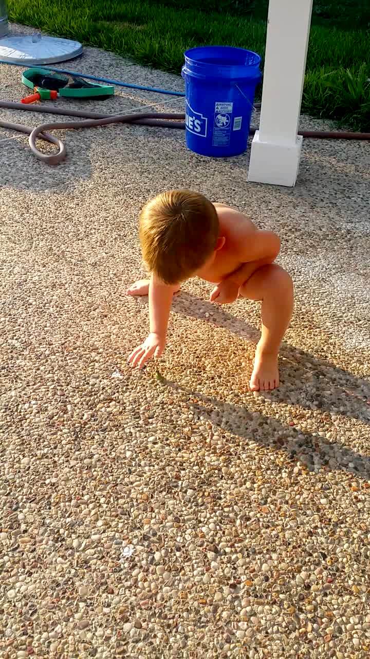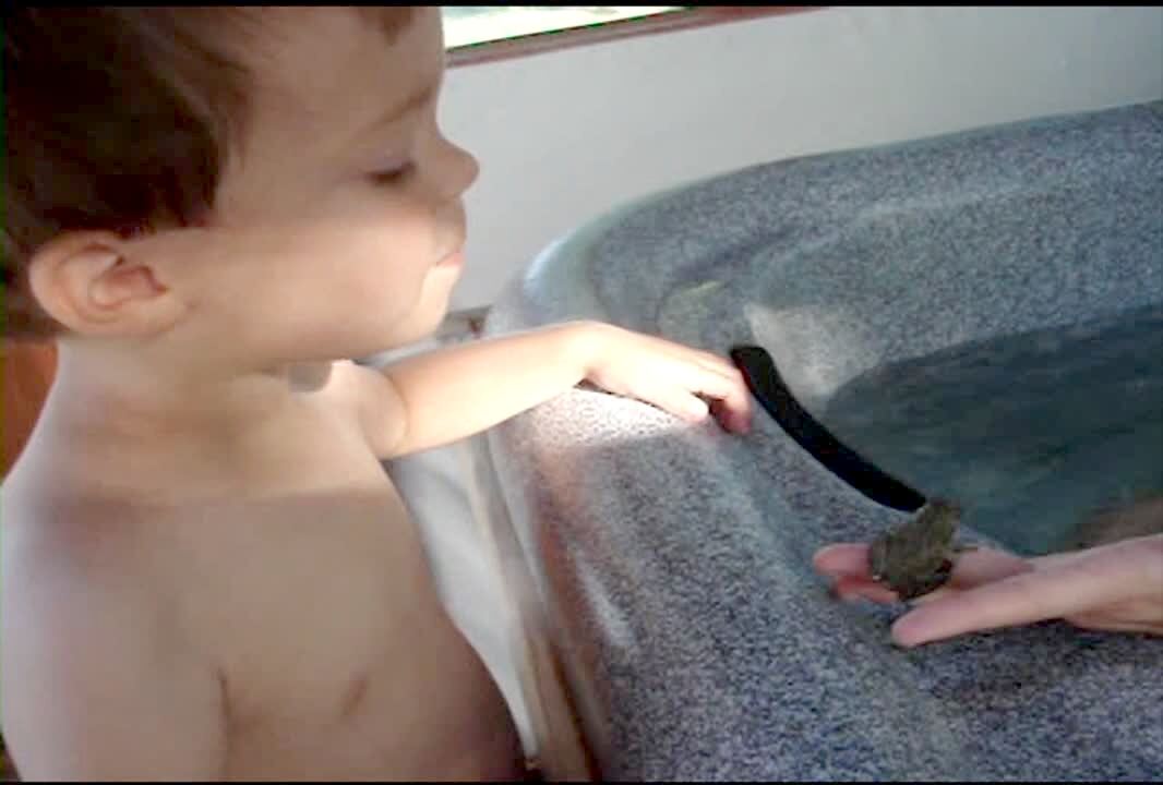 Baby boy pokes a frog with a stick while crawling. Suddenly he grabs the frog and put it in his mouth. Gross.