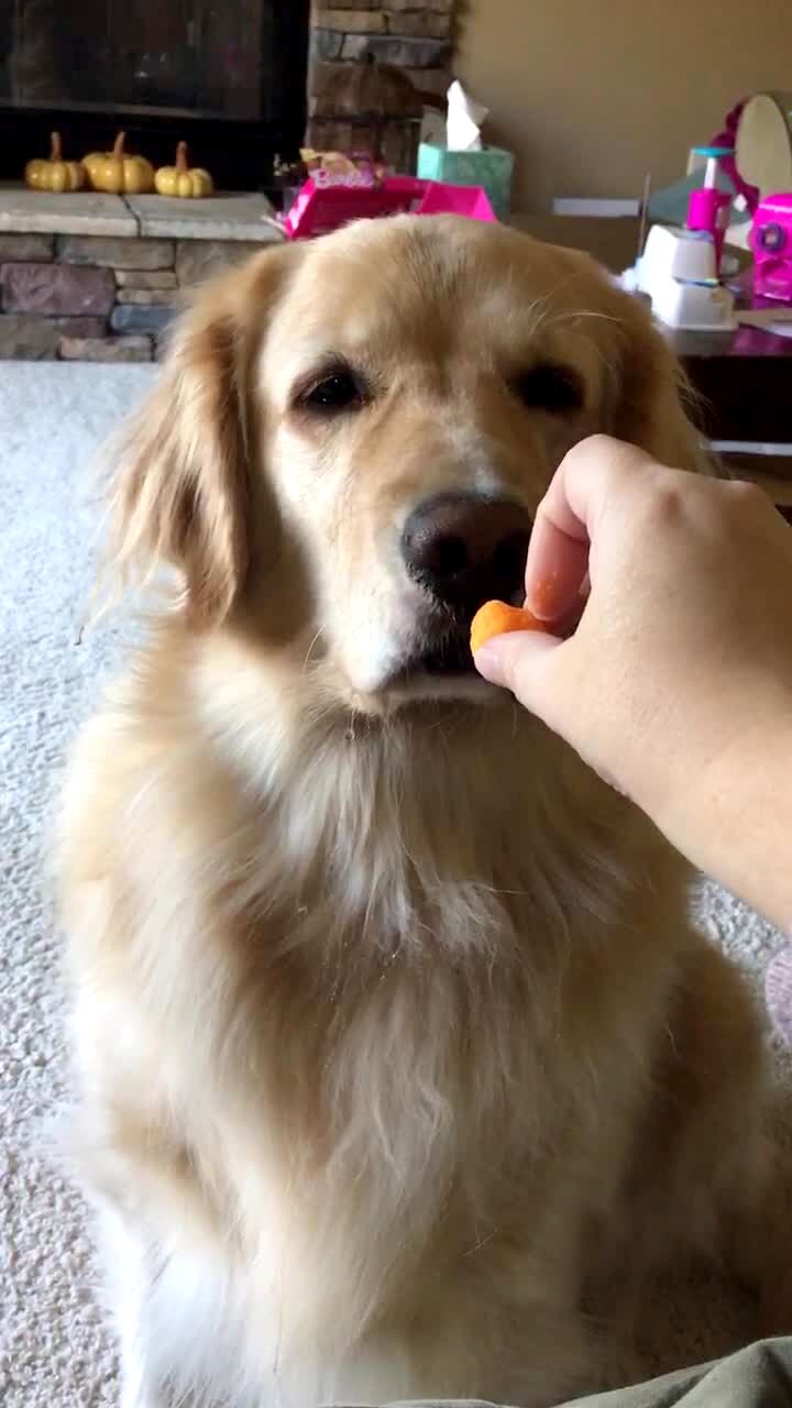 A Golden Retriever dog coughs a cheese puff on to a couch when a man holds another one in front of their face in the living room.