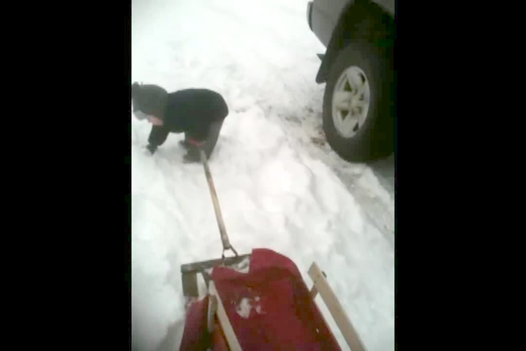 A tot boy pulls a sled around a snow covered yard. He picks up some snow and eats it. Then he reaches for some dog poop in the snow as a small dog runs by. The camera woman screams 'Don't eat that snow, it's brown.' She drops the camera as she jumps to stop the boy. Short tails. Gross.