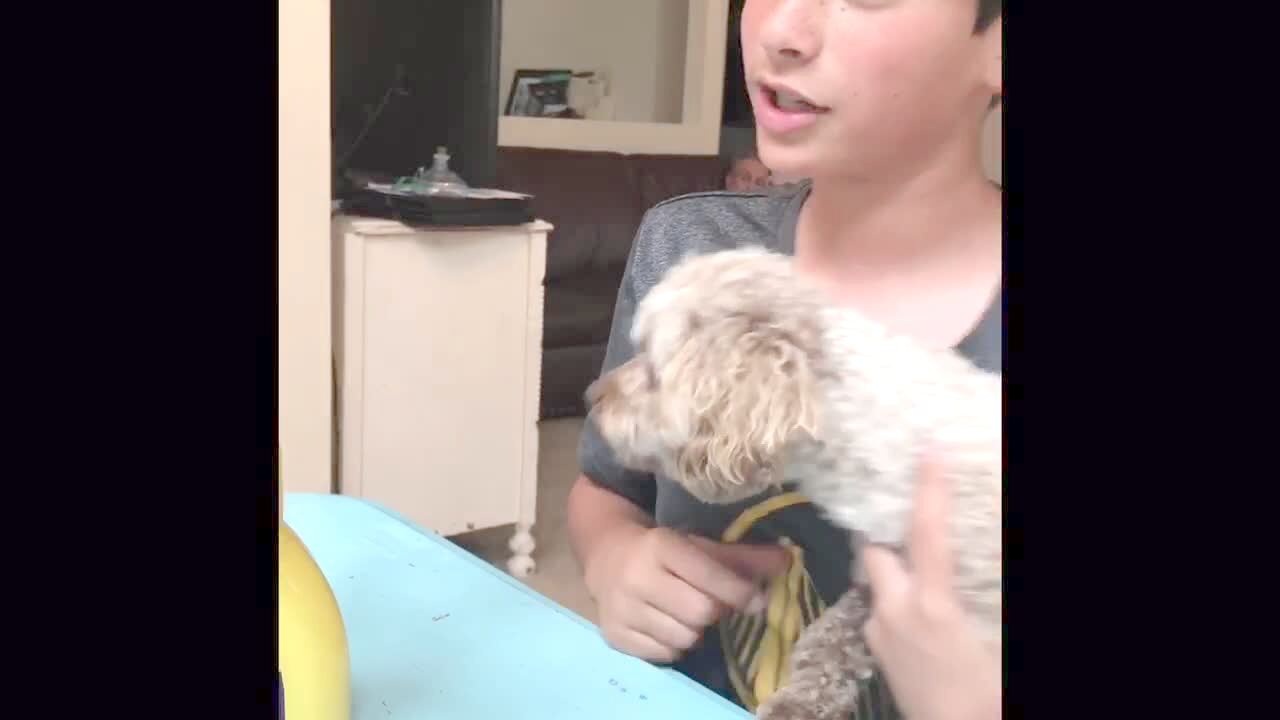 A young boy holds a dog up to the pie in the face game and tries to hit his dog with a pie but it misses the dog and hits him in the face instead