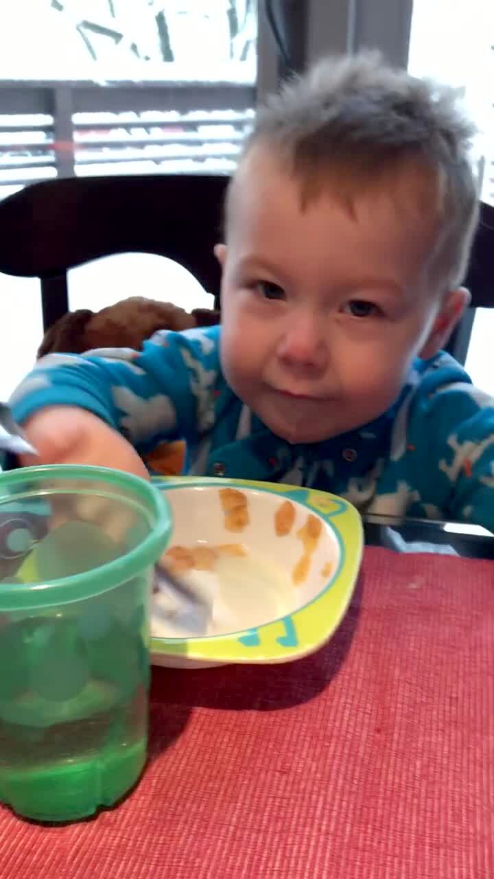 A tot boy tries to eat cereal with the wrong side of the spoon.