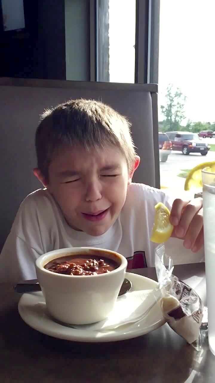 A young boy makes a sour face in slow motion after he tastes a lemon in a restaurant.