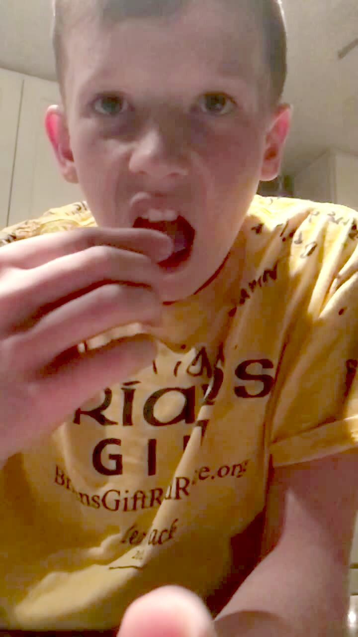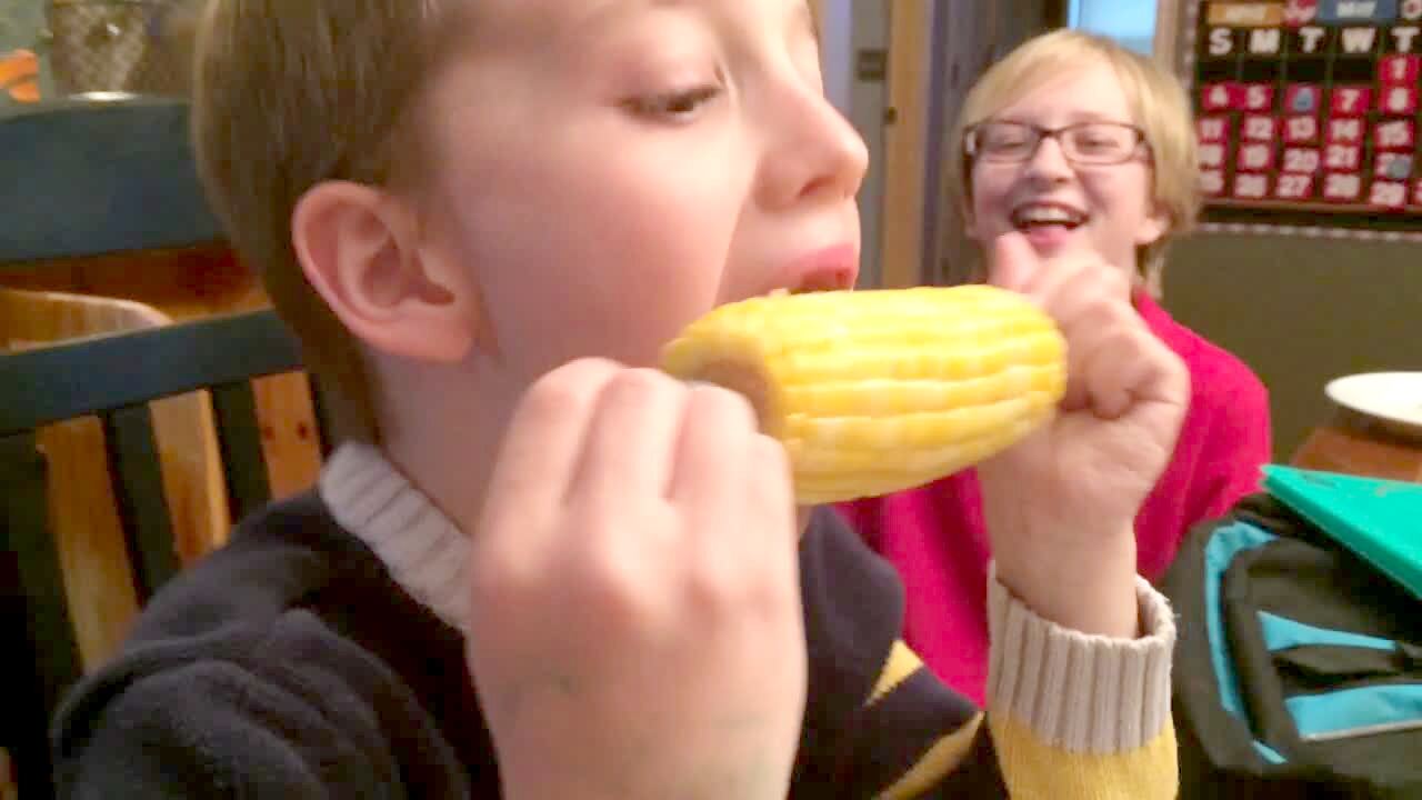 A boy tries to eat corn on the cob with no front teeth at home, to no effect.