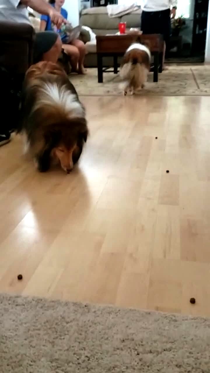 Two Shetland Sheepdogs sit in a living room in front of two rows of dog food pieces. A man tells them to go and one of the dogs eats one piece then turns around. The other dog eats all their pieces and all of the other dog's piece.