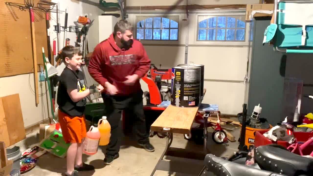 An off-camera father calls his young son out to the garage and tells him to hustle and the boy runs into a piece of tape stretched across the door and it wraps around his head.
