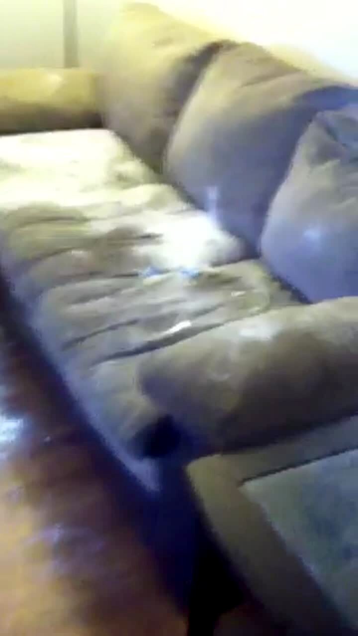 A man finds garbage spread around his floor indoors and asks repeatedly who got in the garbage before he finds his dog on the couch with a bag stuck on his head. He asks the dog who did this, and the dog ignores him and looks away from him.