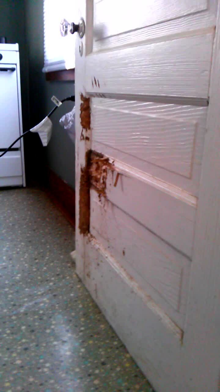 An American Bulldog dog sits indoors with a sign around his neck that reads "I used the door as my chew toy" before the camera pans to show a chewed up wooden door next to him.