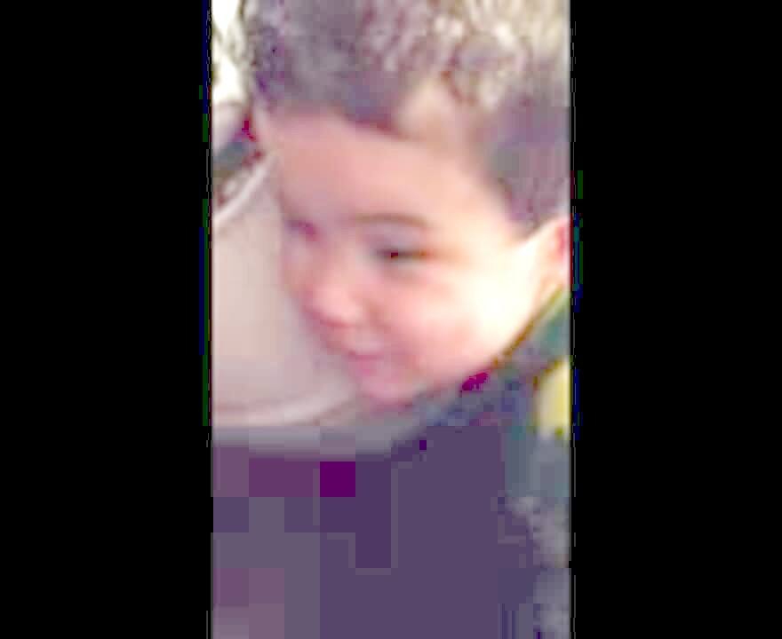 A boy tot sits on his dad's lap at a dinner table and they talk on speaker to his grandparents. The boy tot sneezes and a bean comes out of his nose and into a tissue. The family around him laughs, not realizing that he stuck it up there. Action starts at 1:51.