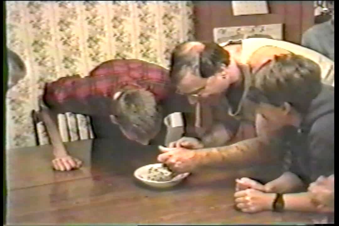 Practical Joke. Family tells teen boy to look really close at bowl of food on the table. They hit the bowl and it splashes in boy's face. Everyone laughs.