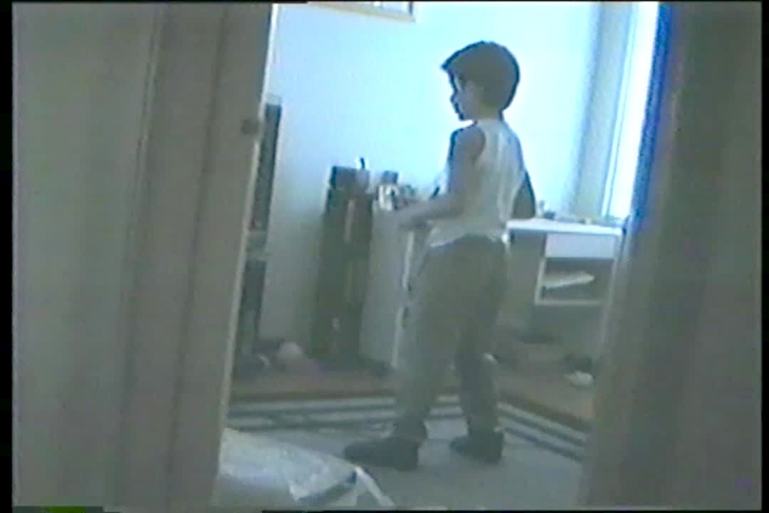 A teen boy tries to do a handstand in his bedroom and he kicks a lightbulb on the ceiling, then it shatters and the room goes dark.