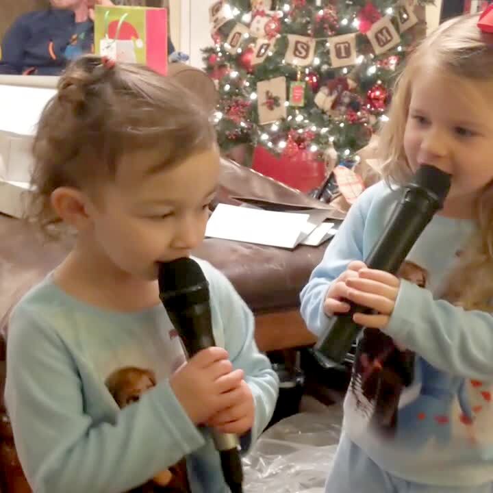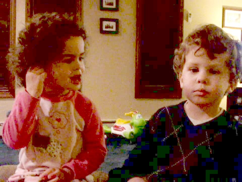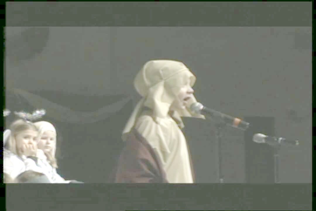 Little boy and girl sing Christmas carols. Girl interrupts boy, boy pushes girl over. Sibling rivalry.