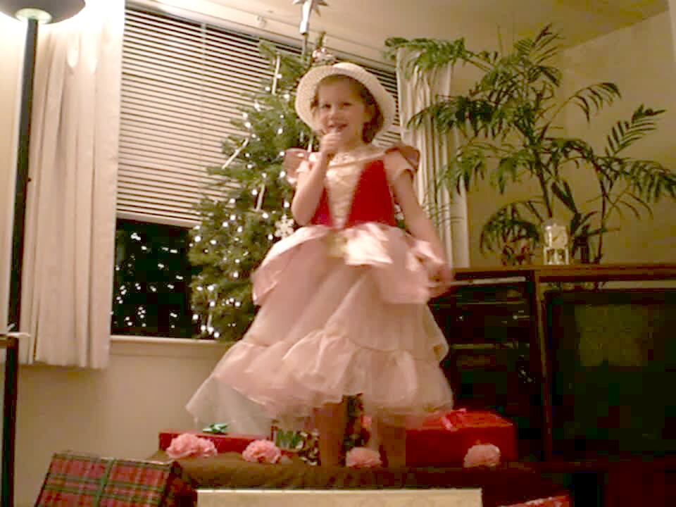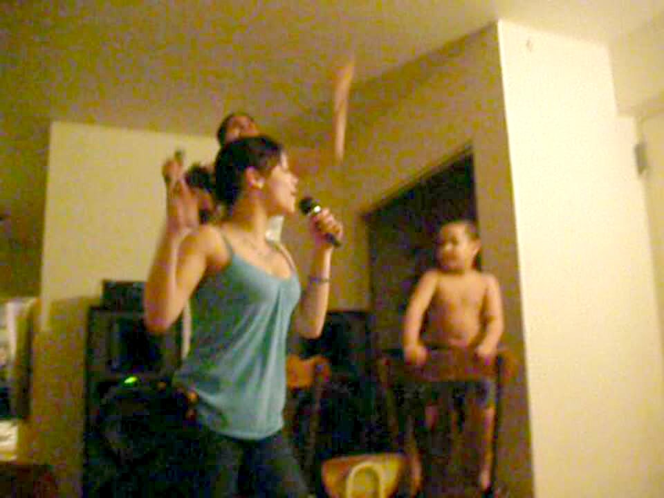 Little girl in puffy dress & bonnet sings karaoke while standing on chair, she falls off.