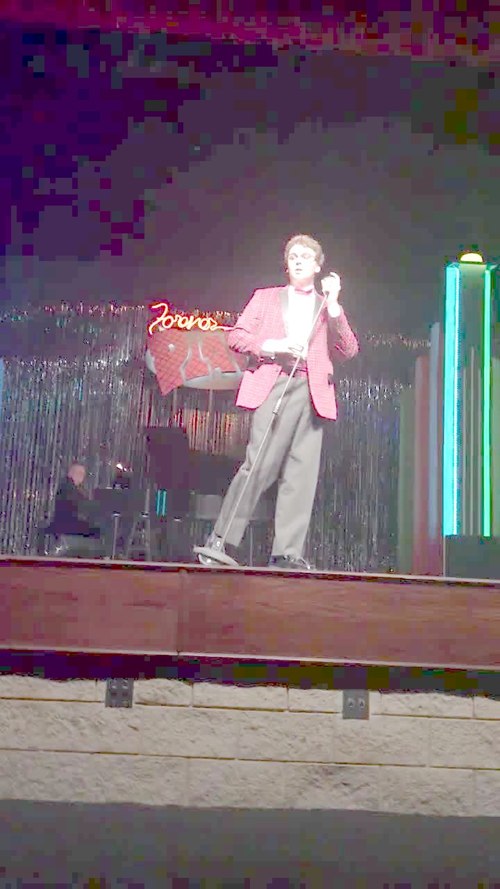 A young man sings in a show and his microphone flies out of the microphone stand and hits a wall. He continues to sing without the microphone and finishes his performance.