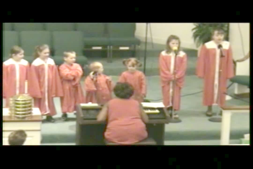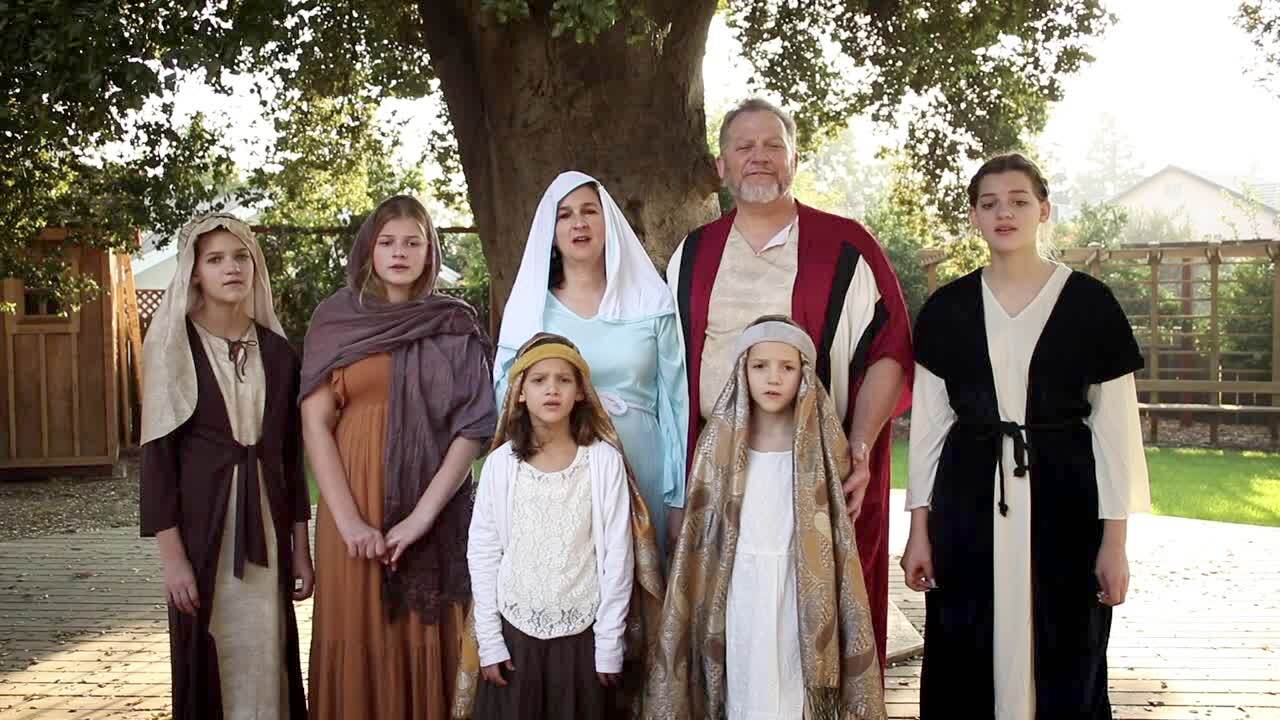 A family sings a church song with costumes in the yard, and when one young girl faints the family turns to look at her. A man and woman bend over to help the girl, and another young girl trips and falls over them on the ground.