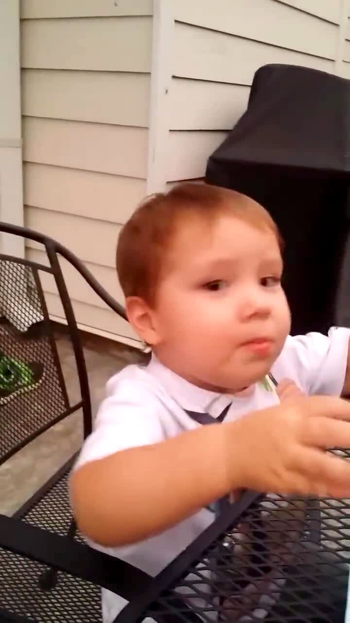 A young girl blows in a tot boys ear as a group of adults and kids sing Happy Birthday to him and, when she blows for a third time, the tot boy shoves her out of the chair that she is sitting in indoors.