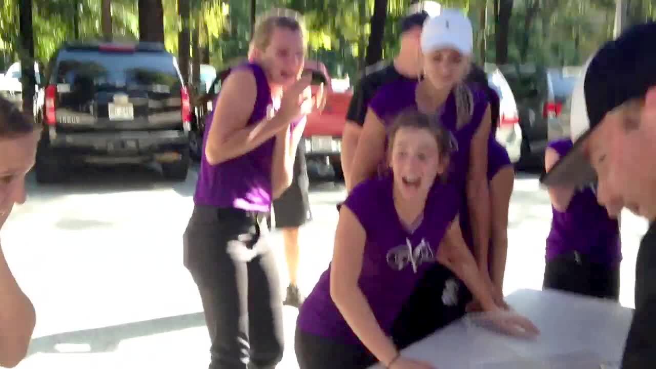 Teen girls sing Happy Birthday to a teen girl outdoors and scream in surprise when a truck honks. The girl blows out the cake candles. Three adult men are visible.