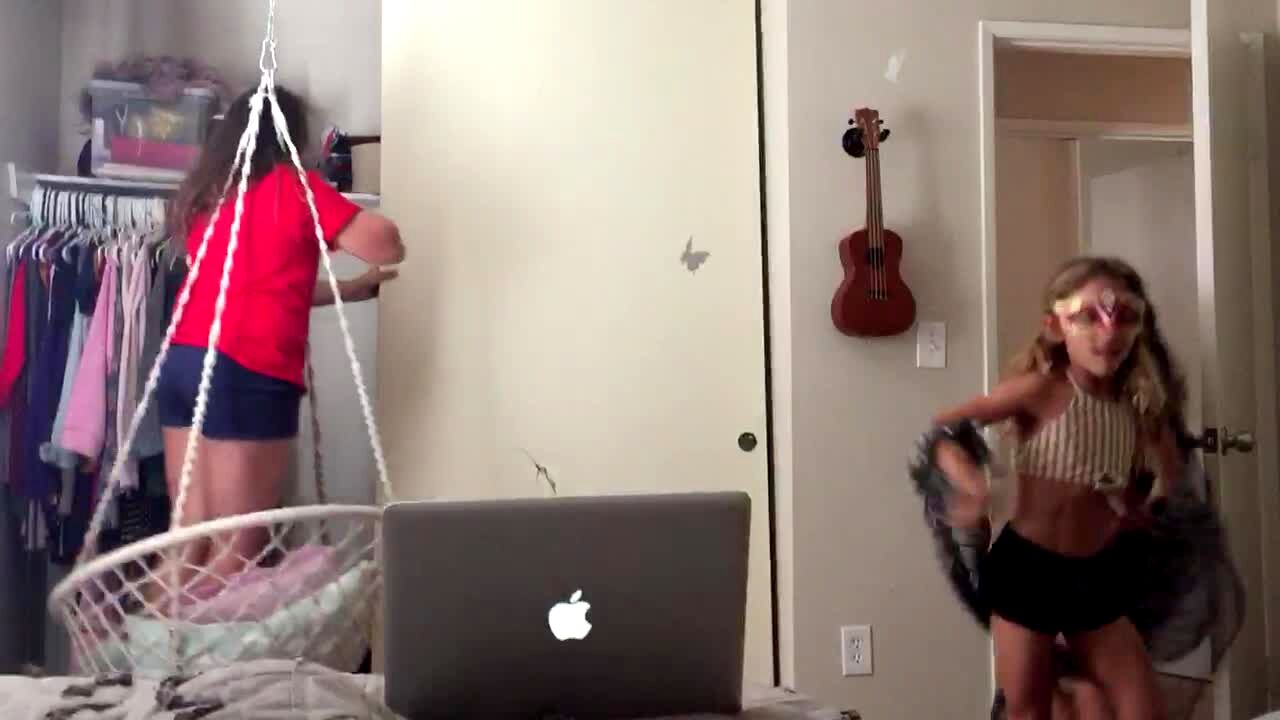 Two young girls dance with scarves in the bedroom as another girl spins in a chair, and the closet door breaks and falls onto a laptop.