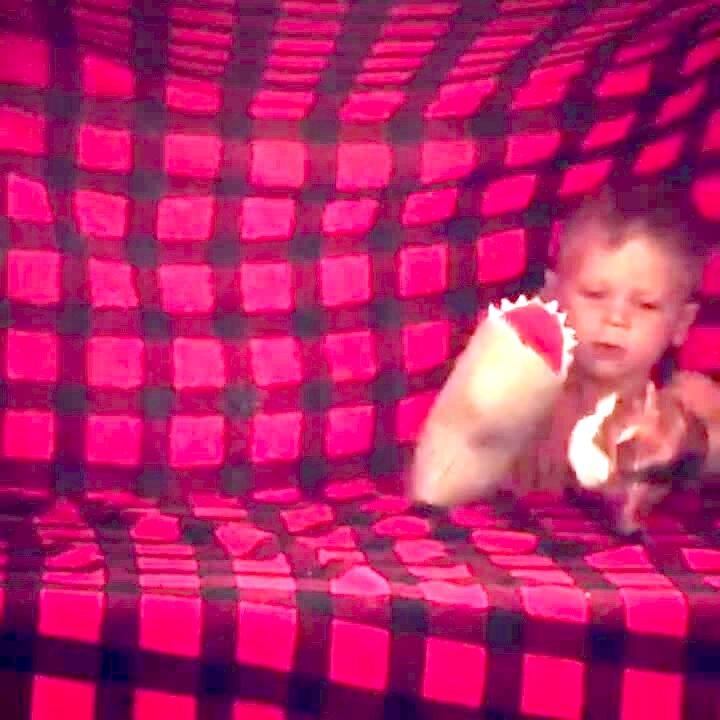 A boy dances in his room as his mom films him between a crack in his door before she crashes through his door and scares him and he screams.