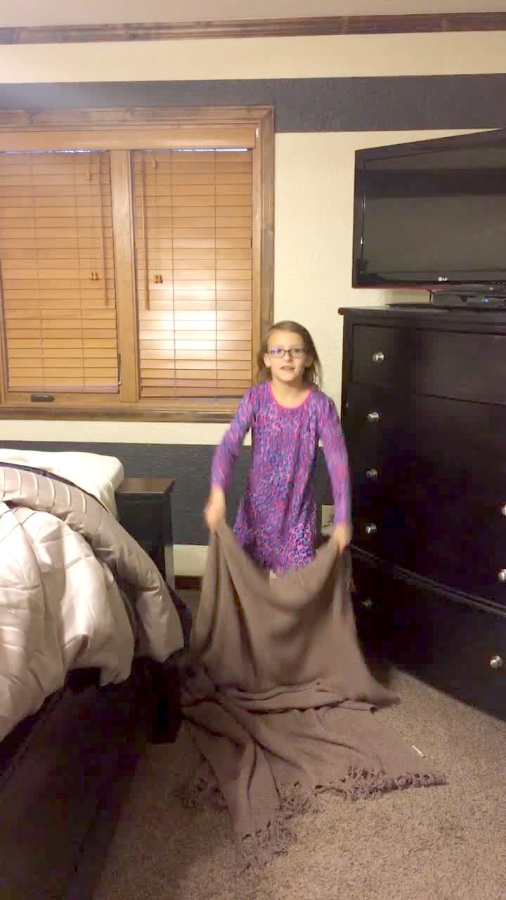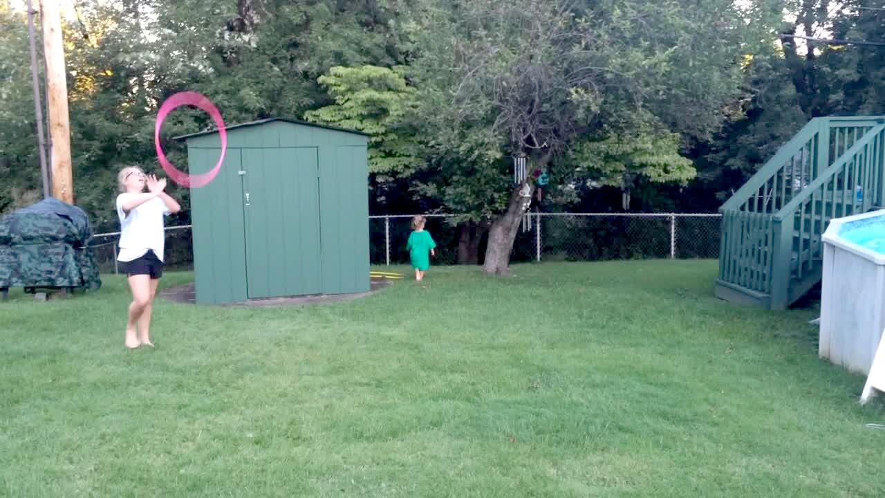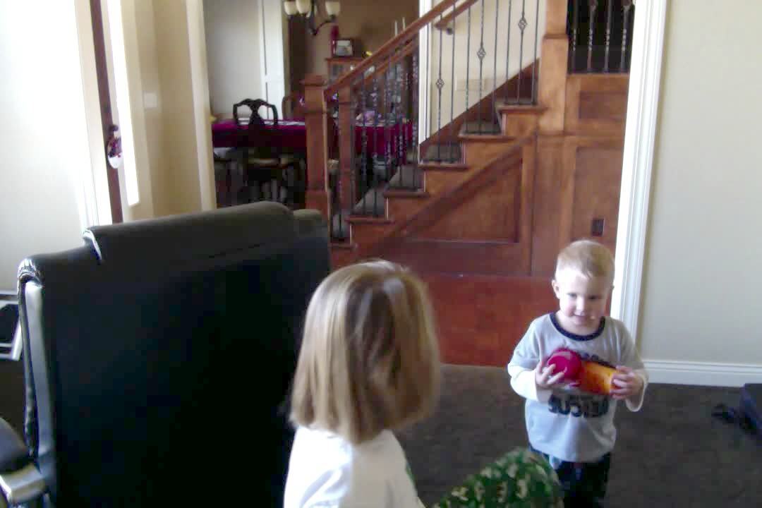 A boy and his sister talk to the camera and push playfully fight to push each other away from the camera. At 3:30 the girl raises a tube of wrapping paper to hit her brother but hits a light bulb on the ceiling and breaks it. The lights go out as the boy and girl try to figure out what to do.