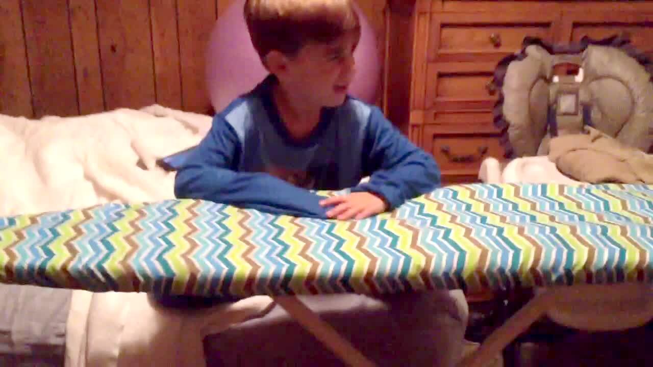 A young boy sits on a bed. he leans on an ironing board that collapses and falls off the bed. Short tail.