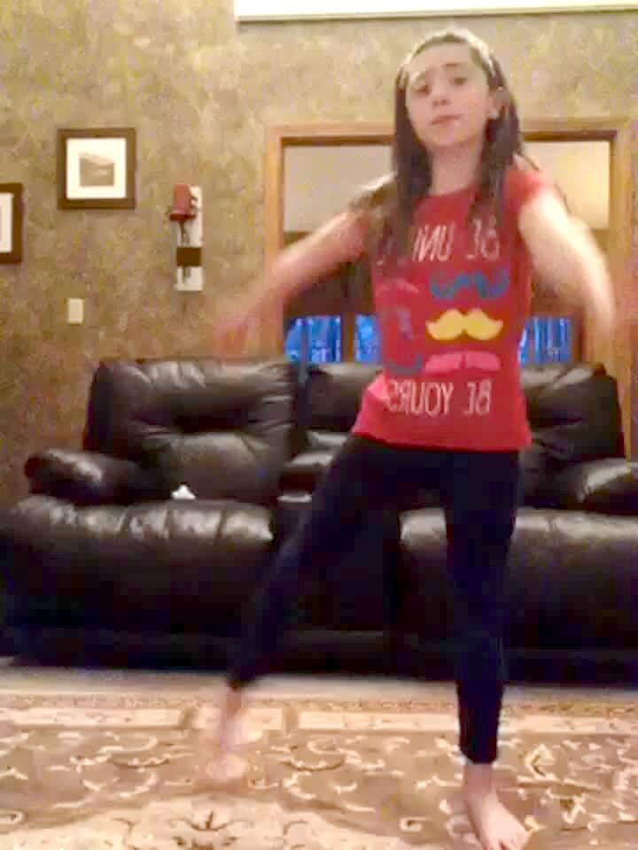 A girl records a video of herself as she does a dance routine in the living room indoors and her brother runs over and tackles her.
