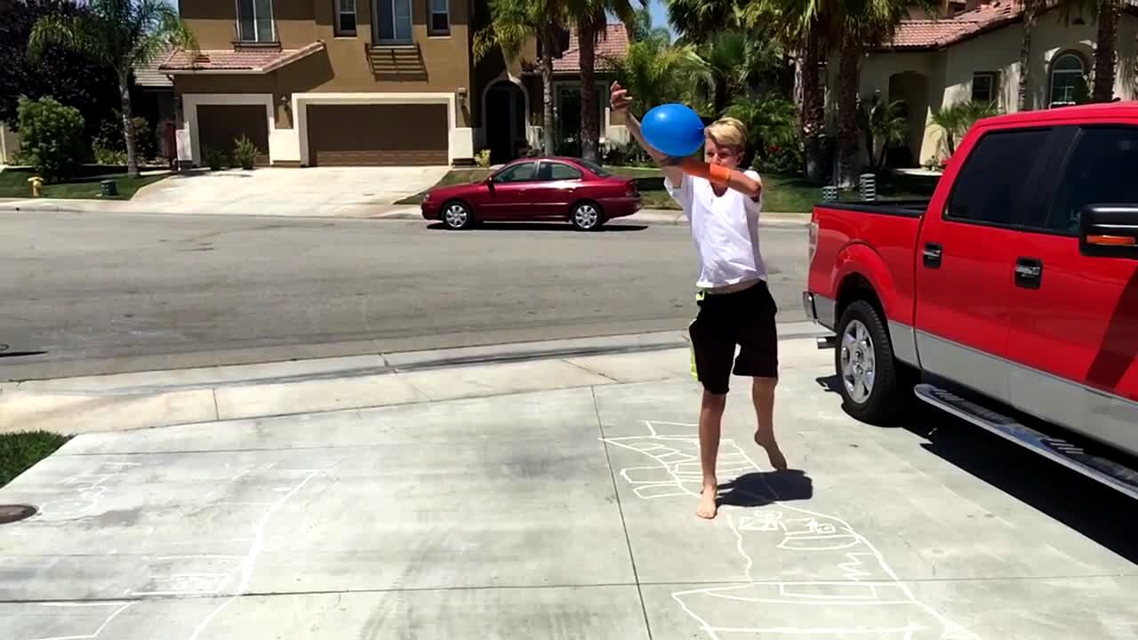 A young teen throws a water balloon up in the air in slow motion outdoors and it bounces on the ground and pops at the very end.