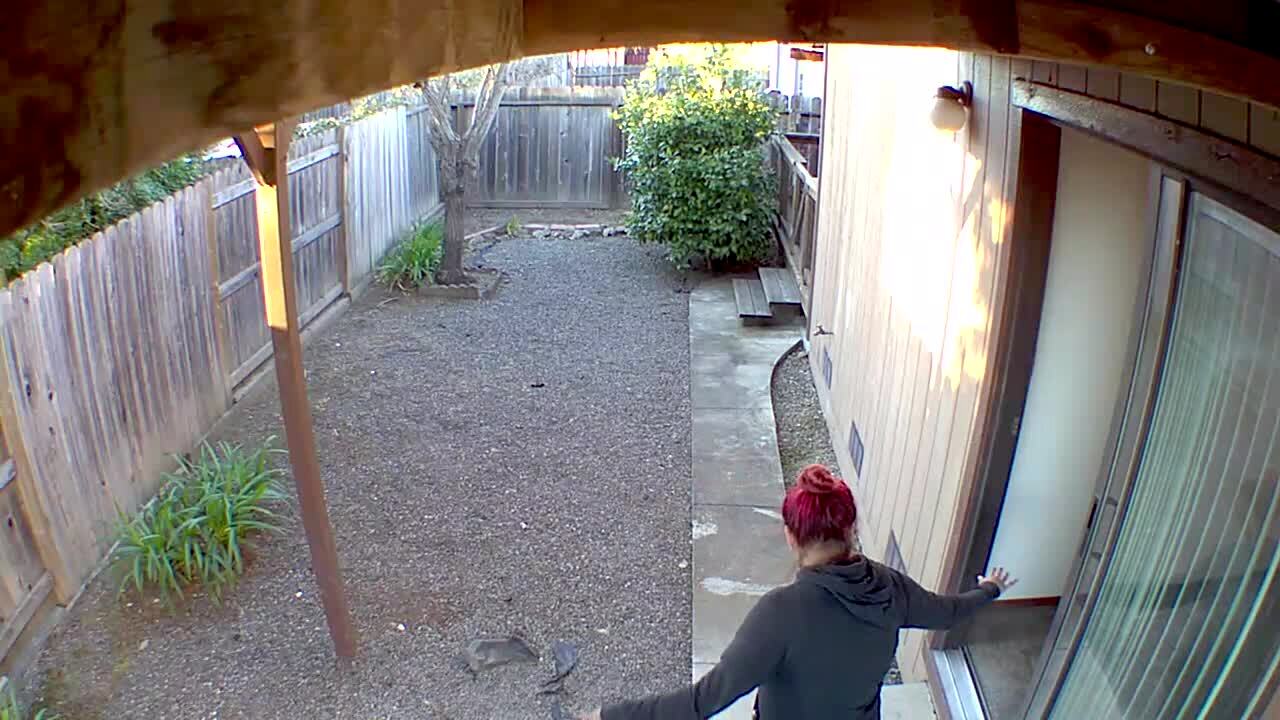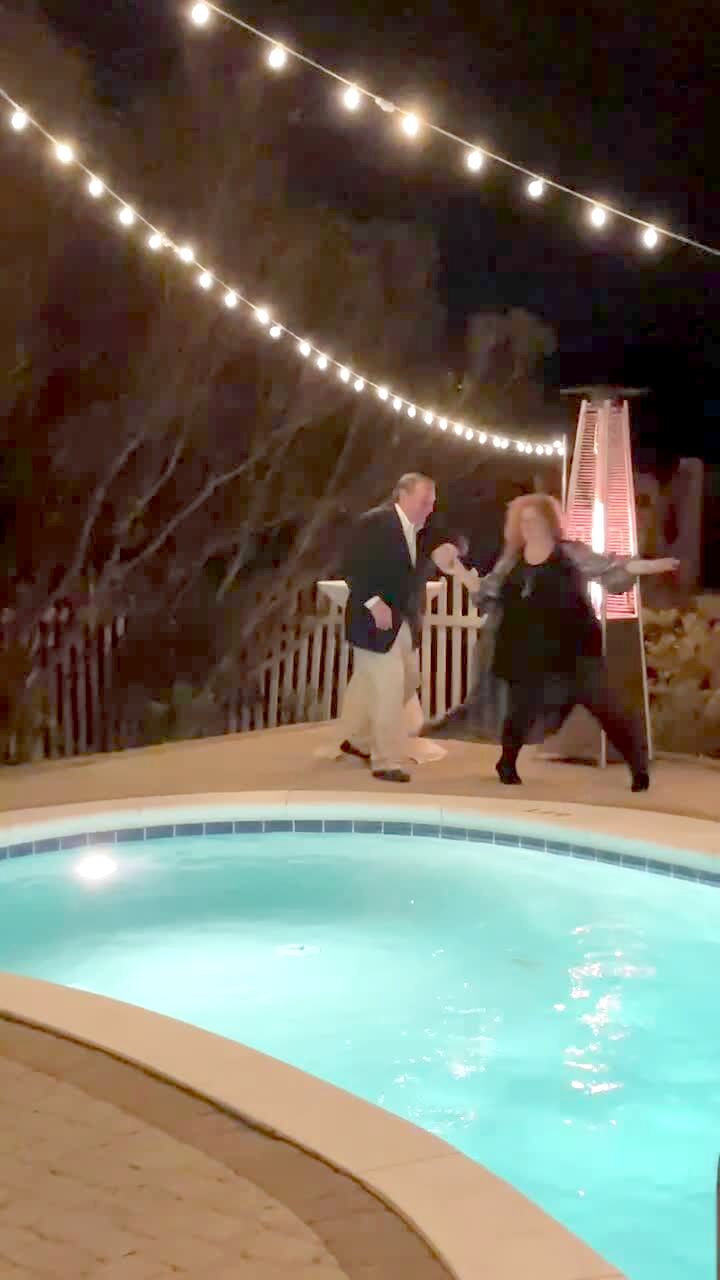 A man and a woman dance near the pool in the backyard and they fall off a ledge into the shrubs and disappear. Music rights not cleared.