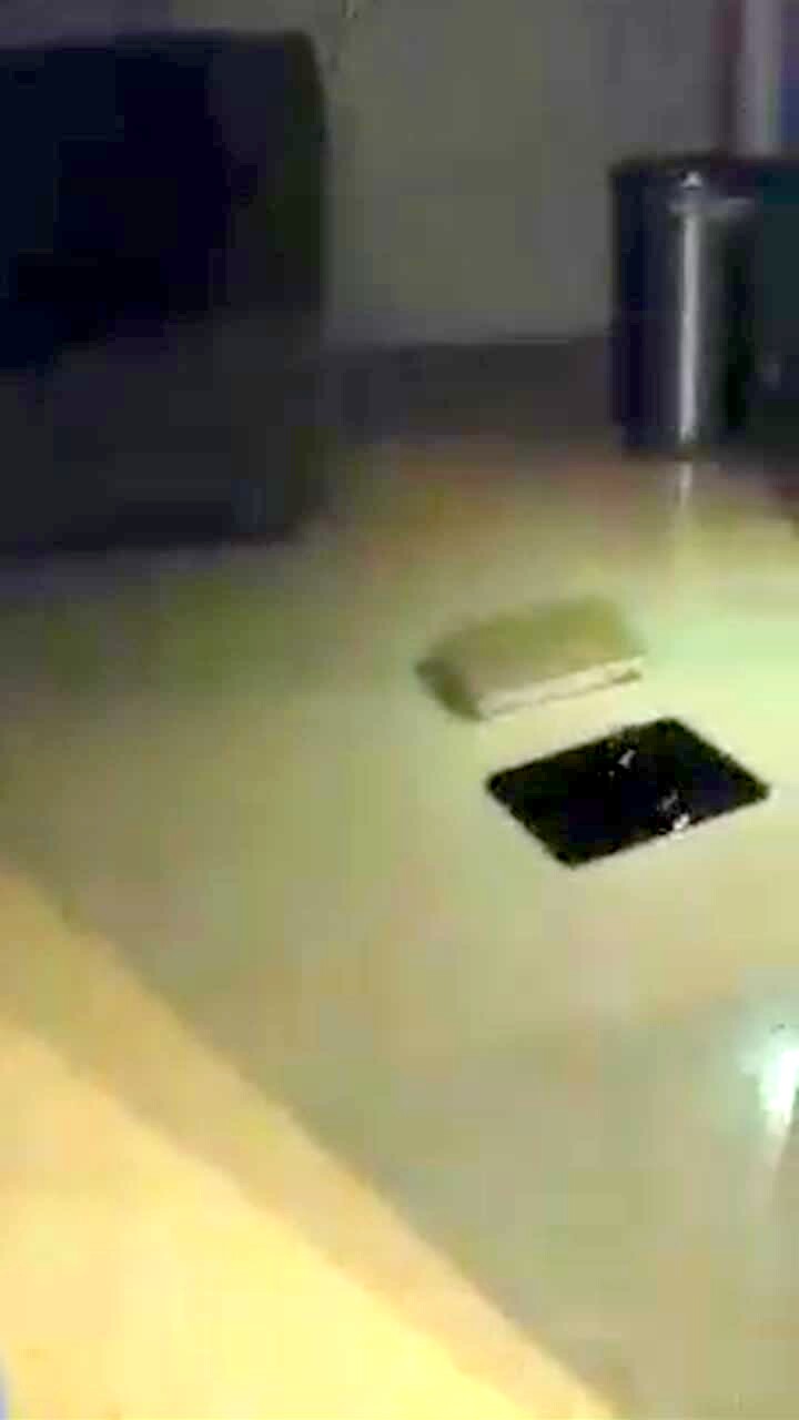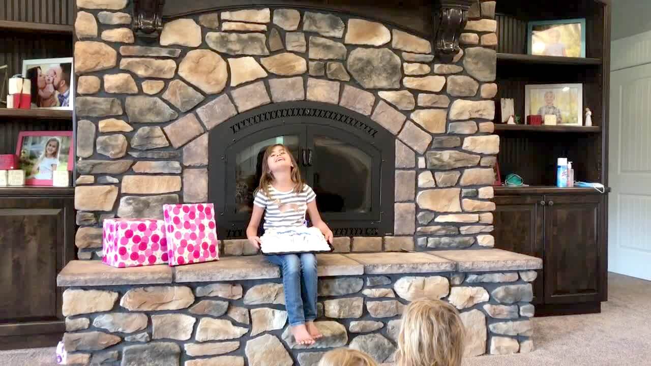A teen girl cheers under a cieling fan and lamp indoors when she hits the chain of the lamp and the light flickers before the chain falls on the floor. She stops the video and says "Just kidding."