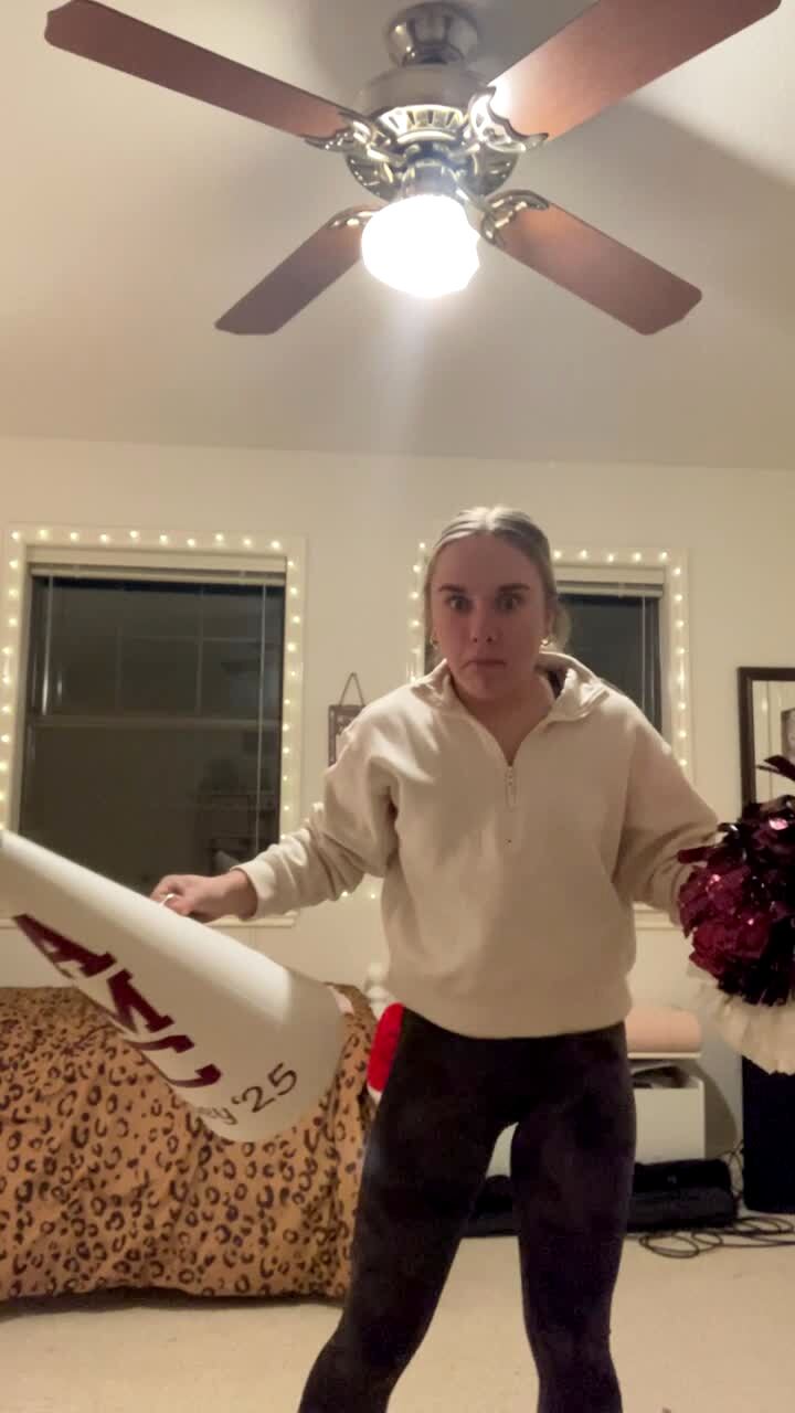 A teen girl attempts to practice her cheer routine in a bedroom, when she raises her megaphone up and hits the ceiling fan light fixture, shattering it.