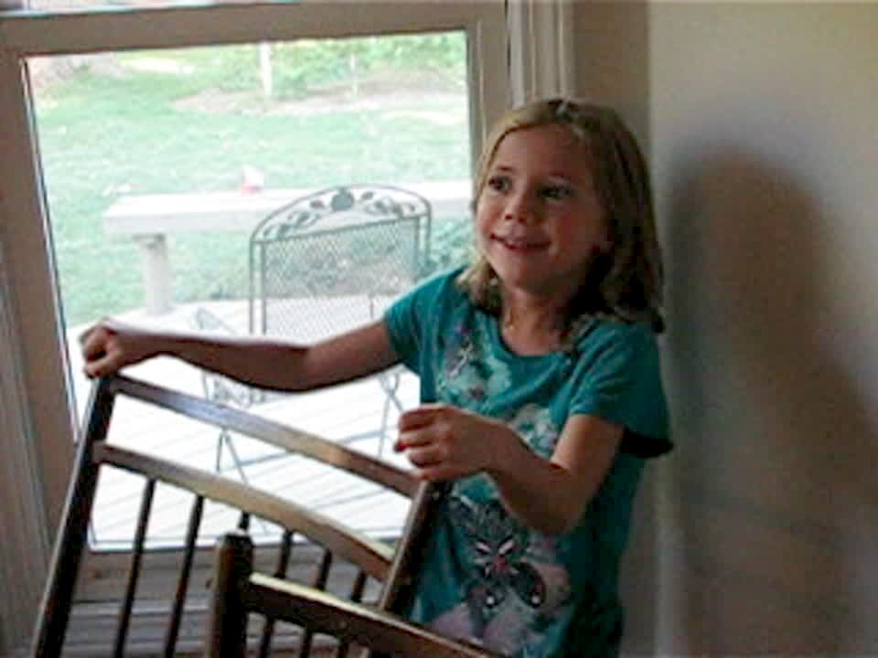 A young girl sings loudly and hits a balloon until a wine glass breaks off camera. The girl makes an anxious face while she waits for her mother's reaction.