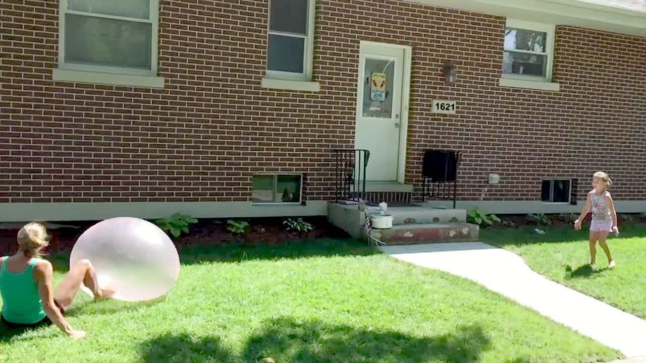 A woman kicks a blowup ball in slow motion and falls down outdoors.