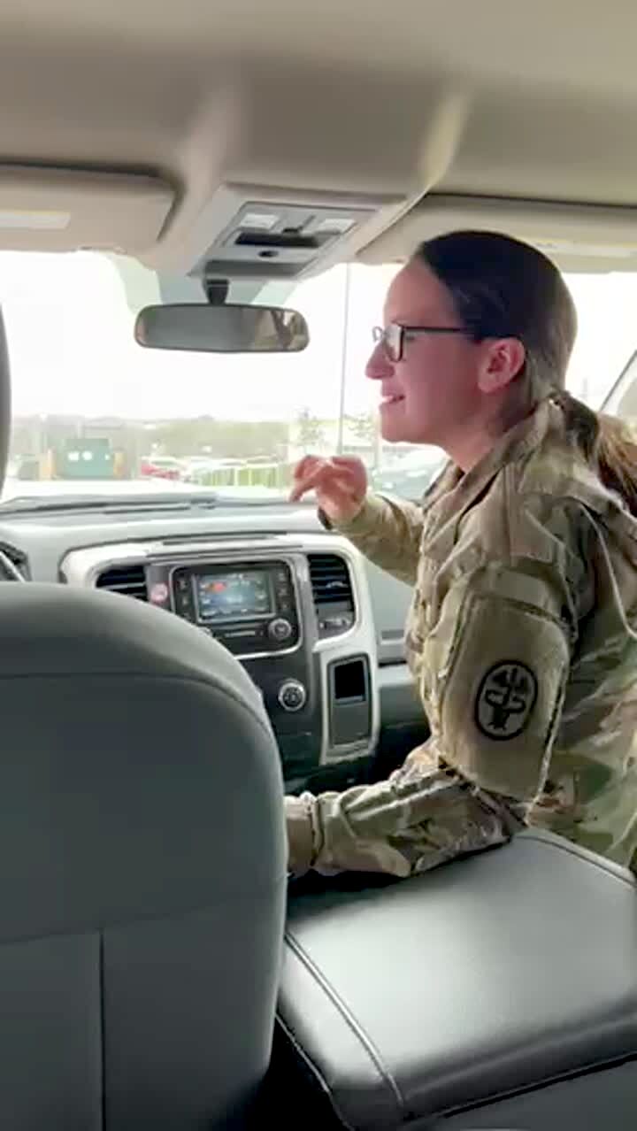A group of women in army fatigues sit in a car at a Starbucks drive-thru and they sing their order and the barista sings back to them over the intercom. Featured talent cleared (the women in the car).