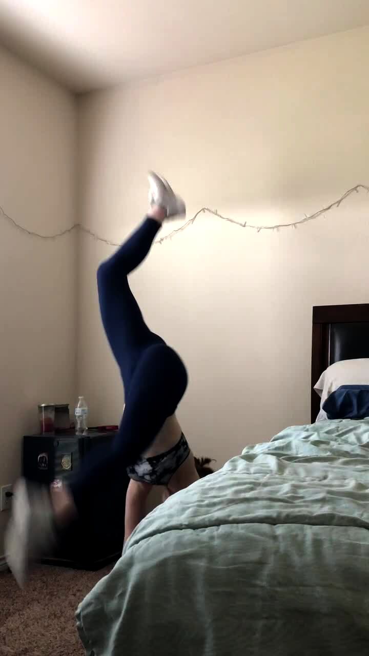 A young woman does a handstand in a bedroom, but she falls, and she breaks a lamp with her foot.