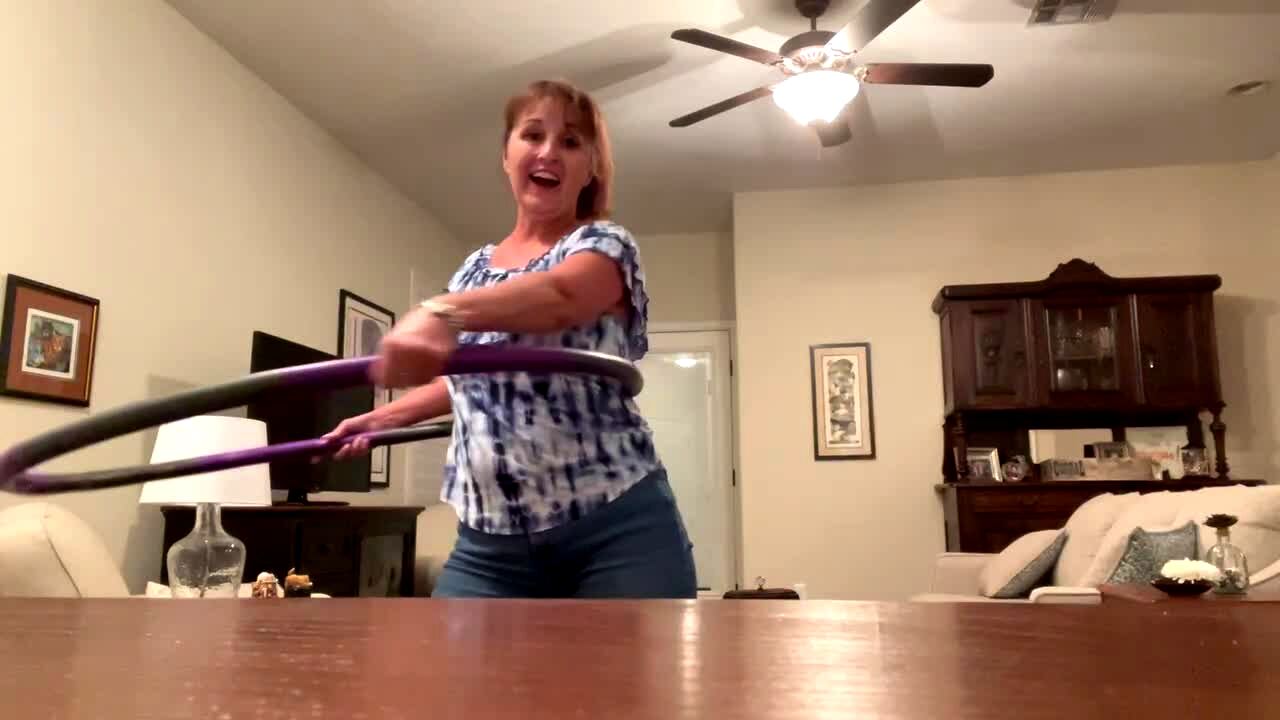 A woman swings a hula hoop and breaks a glass lamp then curses in the living room.