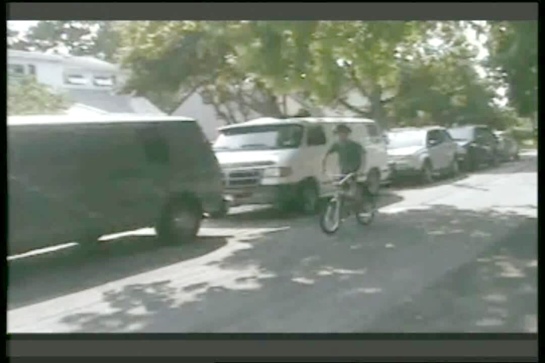 A teen boy tries to ride a bike over a homemade driveway jump built out of a board and a small cabinet. The wooden board of the jump immediately breaks and he smashes into the cabinet crashing over the front of it into the yard.