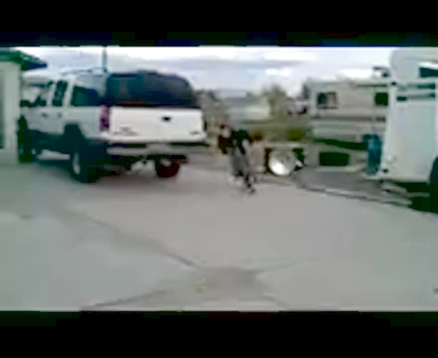 A boy uses a trampoline to elevate to dunk a basketball in a hoop. When he hangs on the rim the entire hoop comes crashing down, pinning him to the ground. Surveillance footage. Screen recording.
