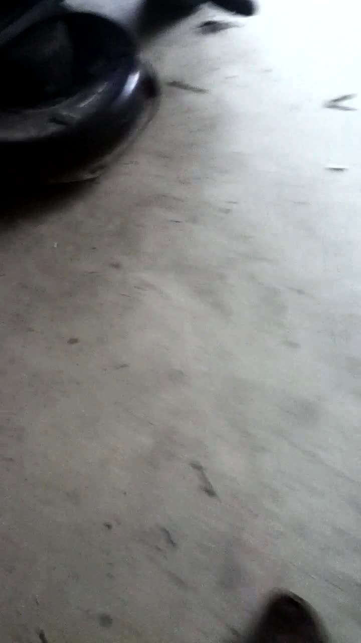 Teen boy jumps on pogo stick in garage. He tries to jump up onto a chair, but falls down hard. Bonehead.