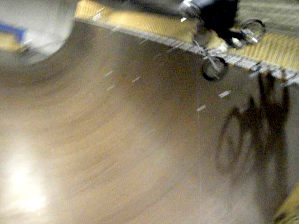 Teen boy rides bike / bicycle on halfpipe, tries to jump from pipe to rail and crashes hard.
