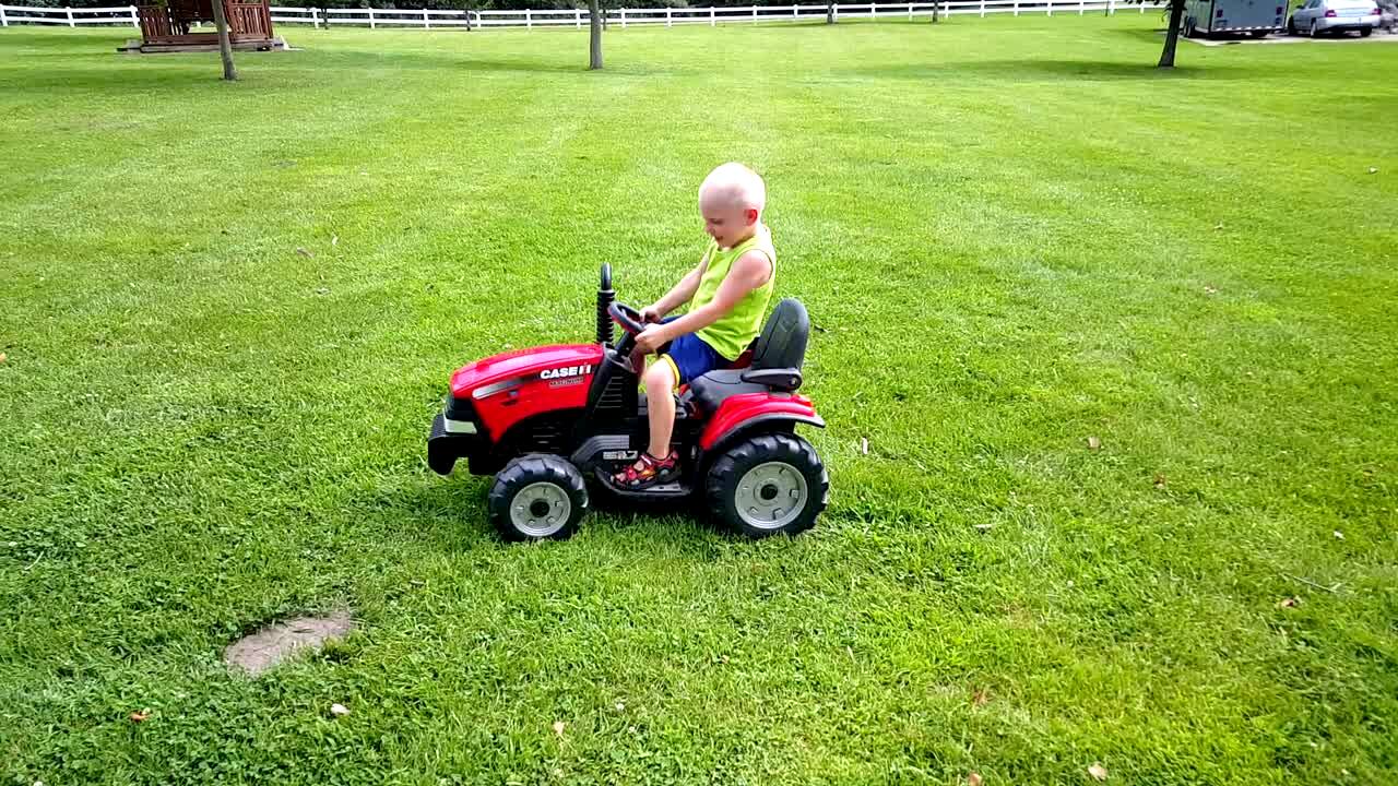 A young boy drives a power wheels car and tries to pop a wheelie when the car tips over.