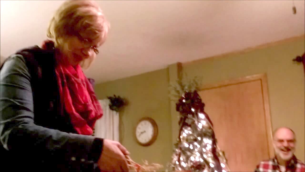 A senior man and woman receive a stack of ornaments from their son and his wife. At 1:35 the woman finds one that says "grandma and grandpa" and screams "HOLY SHIT" as she realizes she's going to be a grandma.