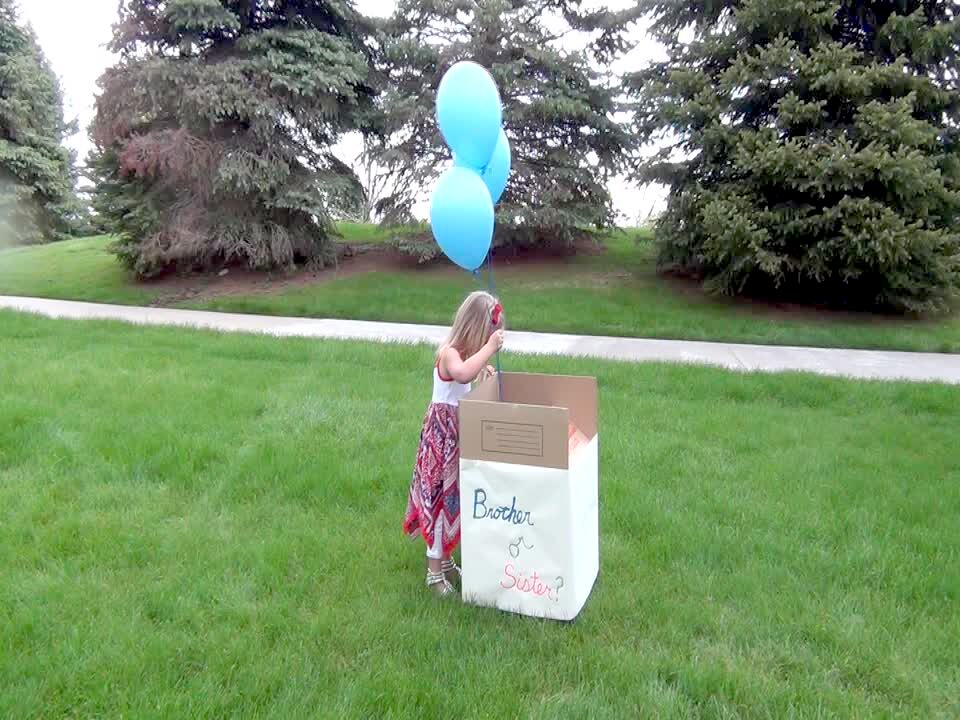 A young girl opens a cardboard box of blue balloons at a gender reveal and she looks down into the box and says, "no brothers are in there." Then, her dad explains to her that the color balloons means that there is a brother in "mommy's tummy" and the girl says, "I think it's going to be a sister."