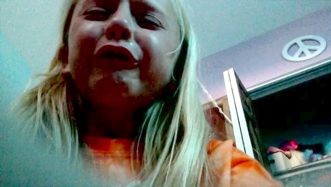 A girl films herself crying in her room after her father ran over her phone with his lawnmower. The phone is in pieces