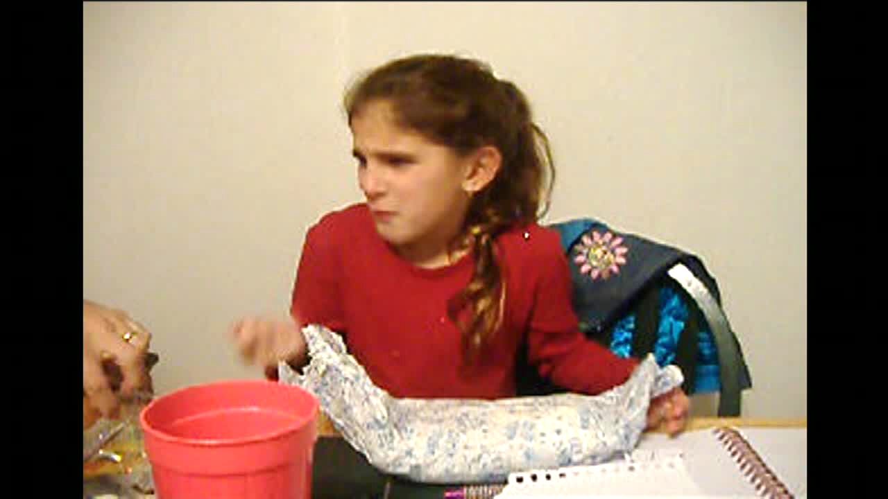 A girl opens a birthday present indoors and finds a two tin cans attached by a string which her parents explain is the phone she asked for. She throws the can down, hangs her head and cries before she walks away. Practical Joke.