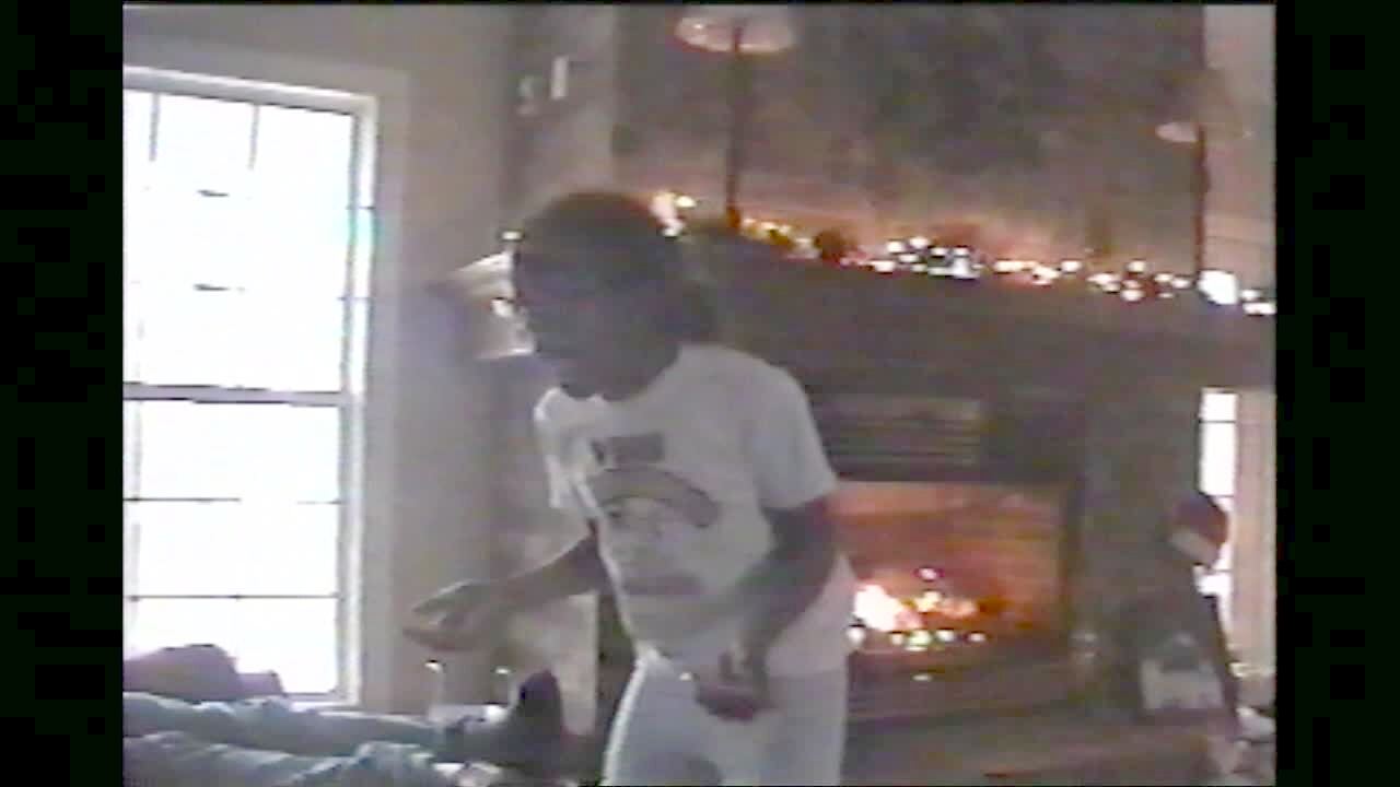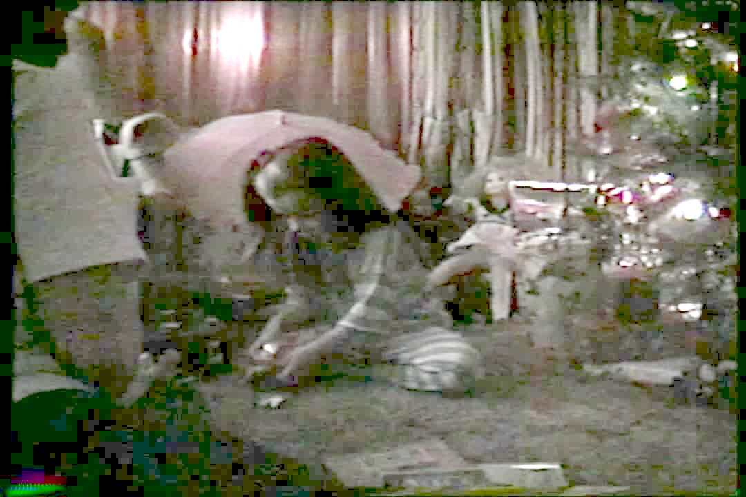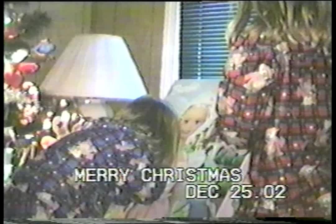 Girl at Christmas opens and gift screams. She holds the box and spins in circles, then falls into a small glass table. She cries and yells to stop taping.