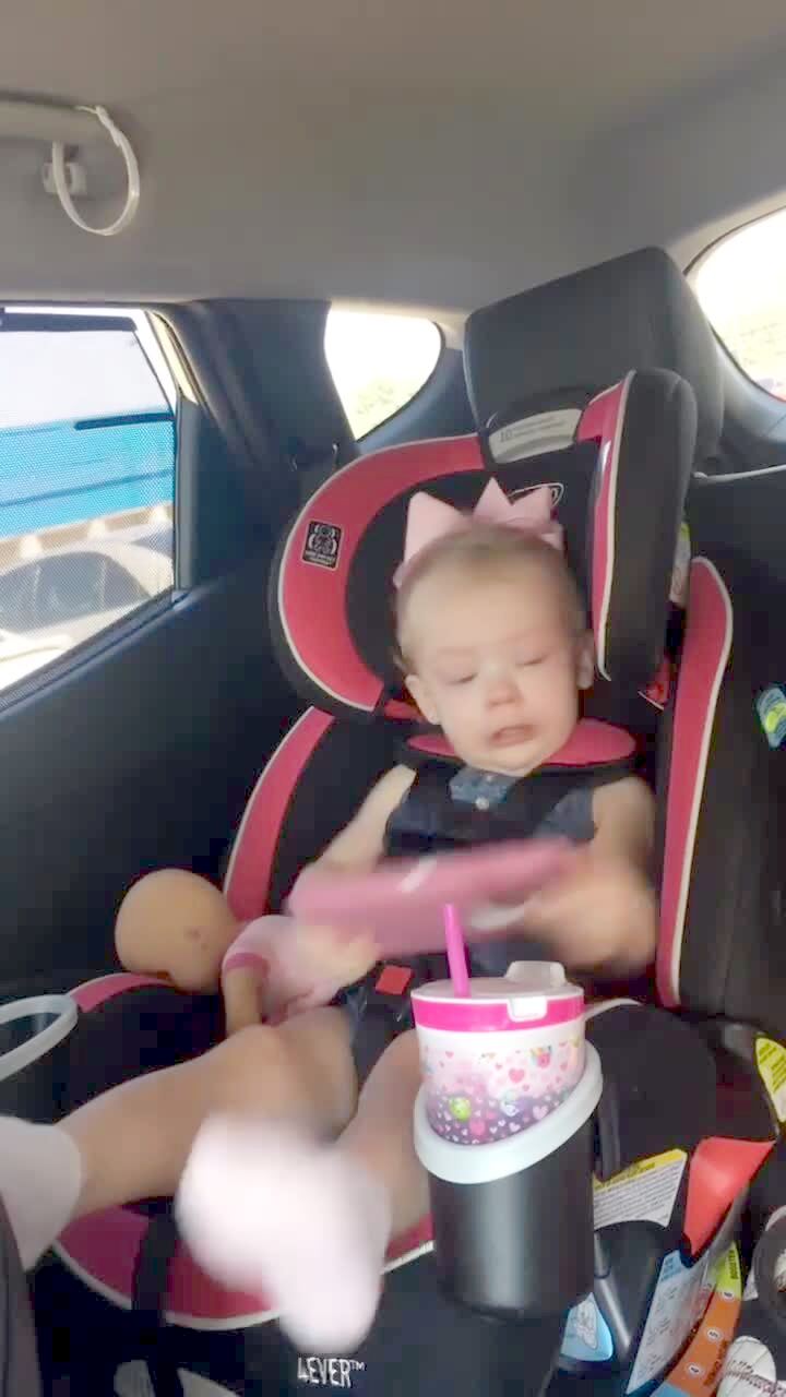 A tot girl plays with a woman's cellphone in the car and screams then cries when the ringer sounds.