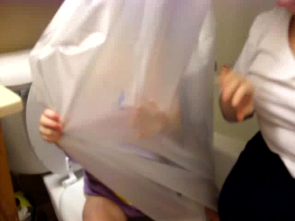 Tot girl pees on the toilet, mom sits on edge of the bath tub talking to girl. Mom falls into the tub & gets stuck. Tot gets kicked in the face when mom falls. Bathroom.