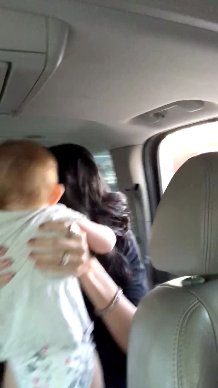A woman holds a baby girl and sits in the back of a car. She tries to change the baby's diaper, but gags repeatedly. She tells her husband to change the diaper, and he laughs.