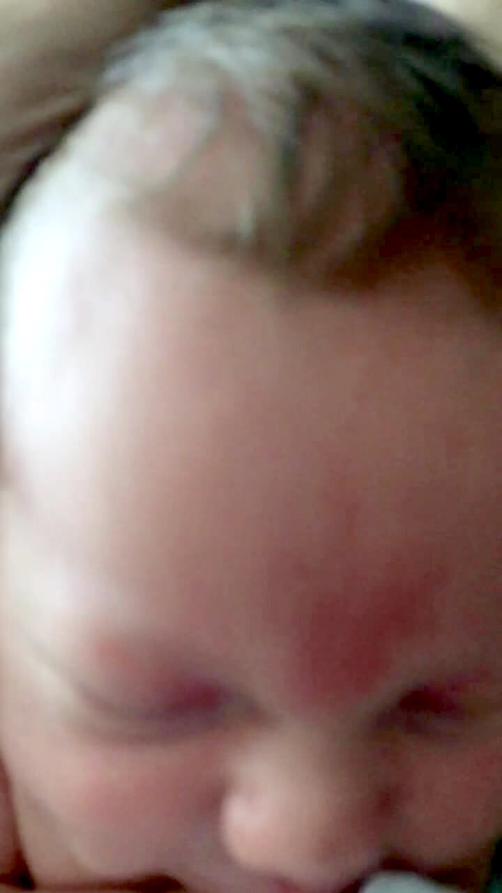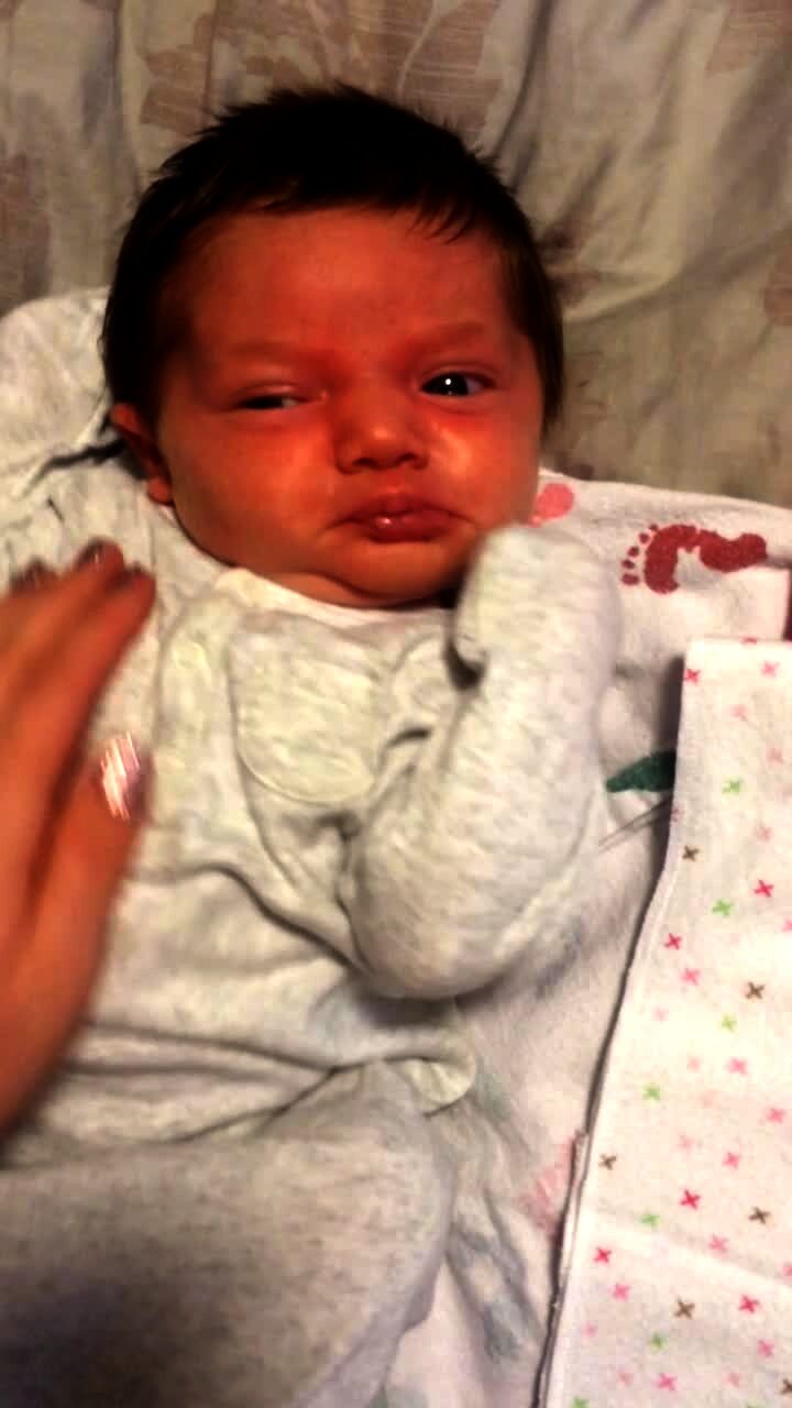 A woman tells her baby granddaughter to say good morning repeatedly and the baby girl makes constipated faces before she loudly poops her diaper.
