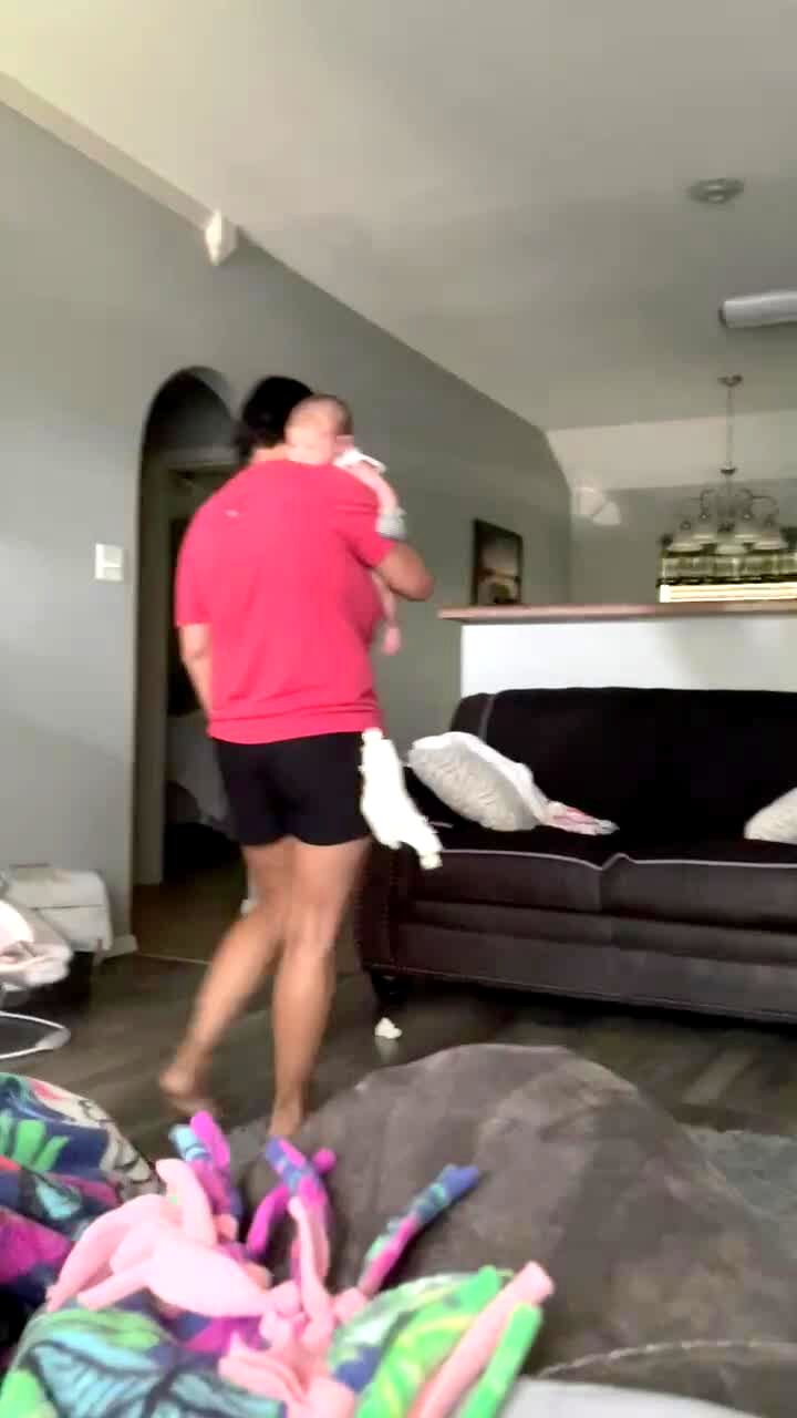 A young girl sits on her mom's shoulders and pees on her back as she laughs hysterically in a living room.