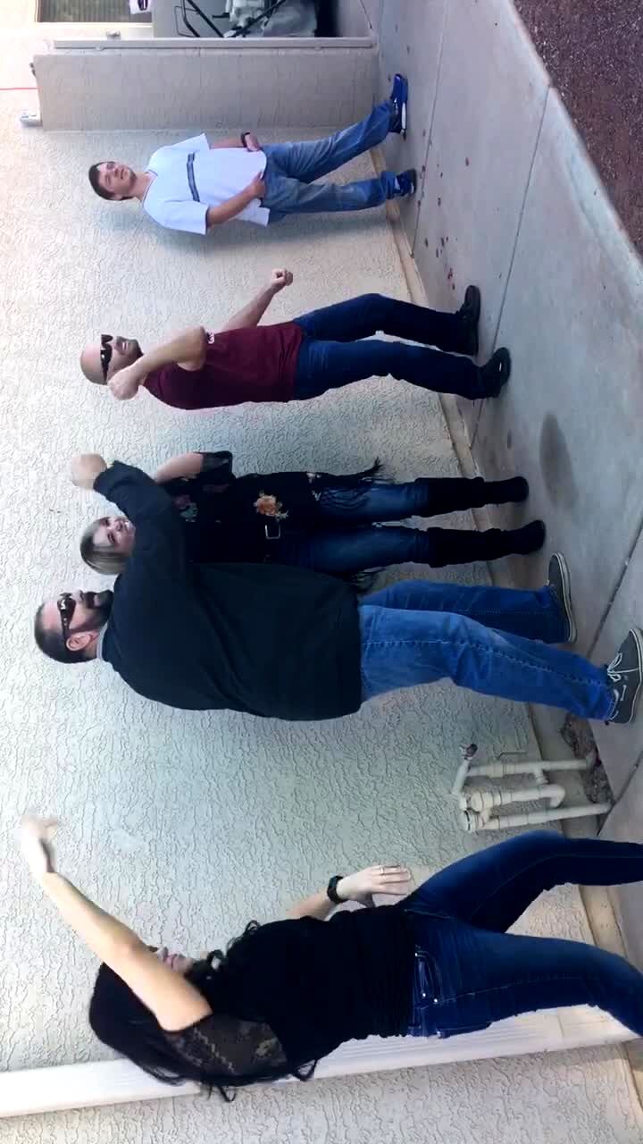 Five tot boys walk out of a tent outdoors and each of them trips over the zipper door one by one until the last boy sees that everyone has fallen and drops down to the ground on purpose.